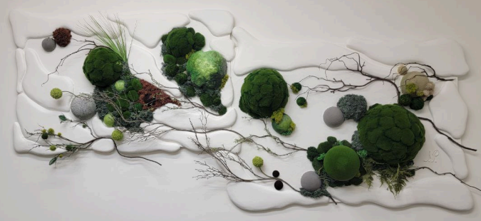 Wood panel, foam, plaster,fiber, acrylic, artificial moss, branches 35” x 52”, 43” x 56”2025$1300
